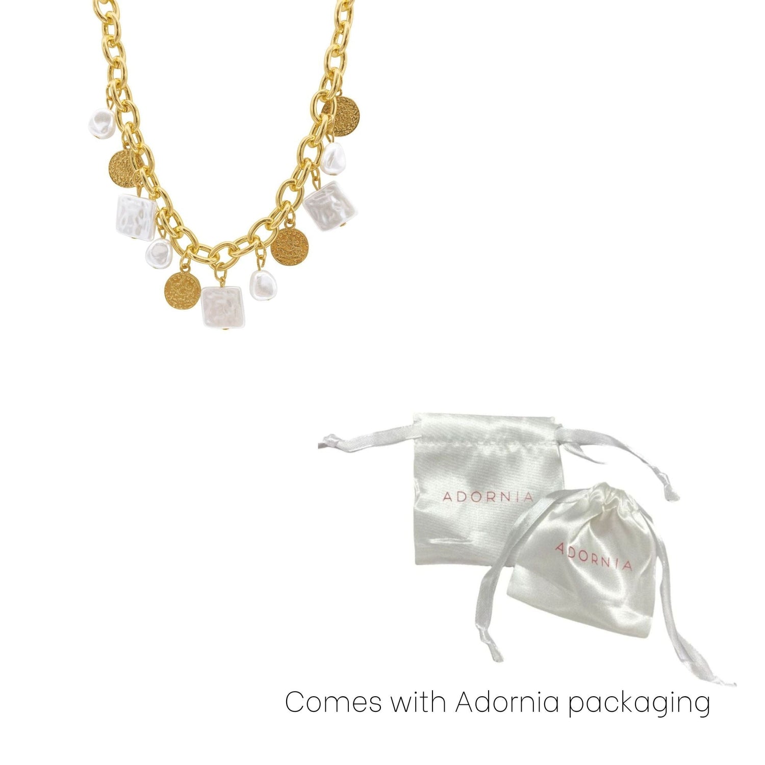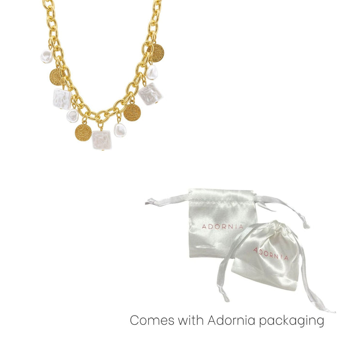 This 14k Gold Plated Oval Link Chain with Hammered Coin and Multishape Pearl Charms Necklace by Adornia brings a luxurious touch to everyday wear. The necklace features 14k gold-plated brass with hammered coin and multishape pearl charms, combining elegance and texture. Perfect for layering or wearing solo, this piece adds a chic statement to any look.
