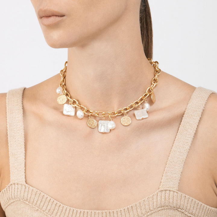 14k Gold Plated Oval Link Chain With Hammered Coin And Multishape Pearl Charms Necklace