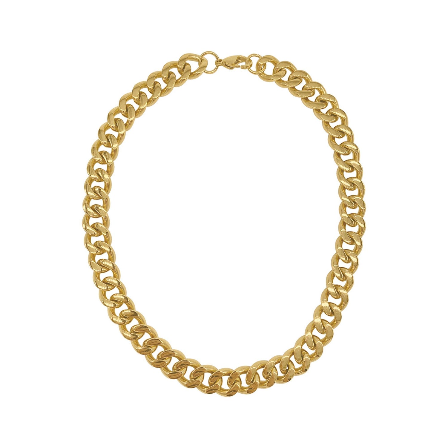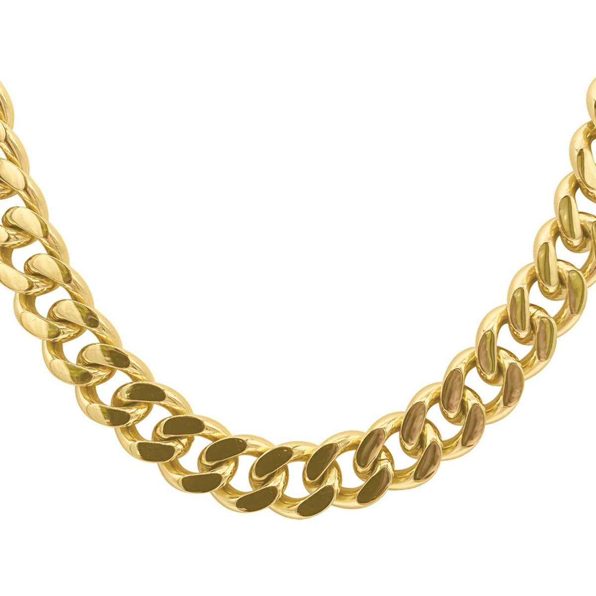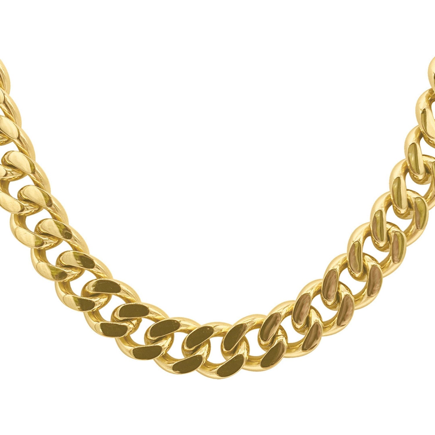 14K gold-plated stainless steel, 17' length, 15mm thick curb chain, lobster closure.