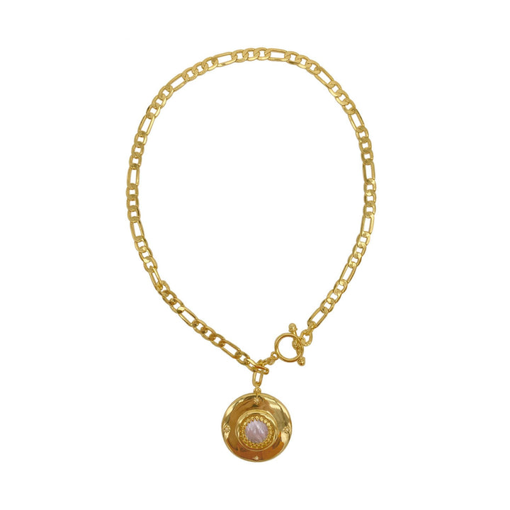 Crafted in 14K yellow gold-plated brass with a 1.5' diameter mother of pearl disc. Chain length is 17', 5mm thick. Secured with a toggle closure.