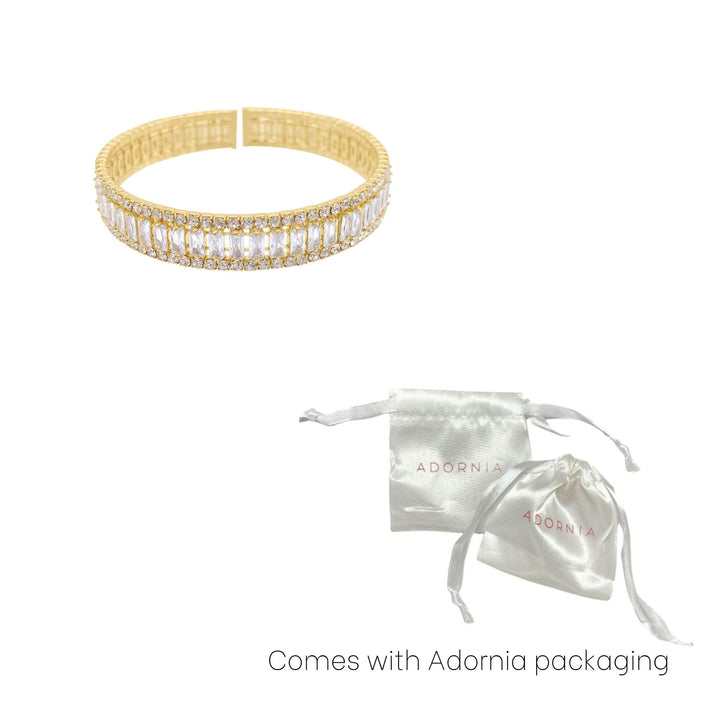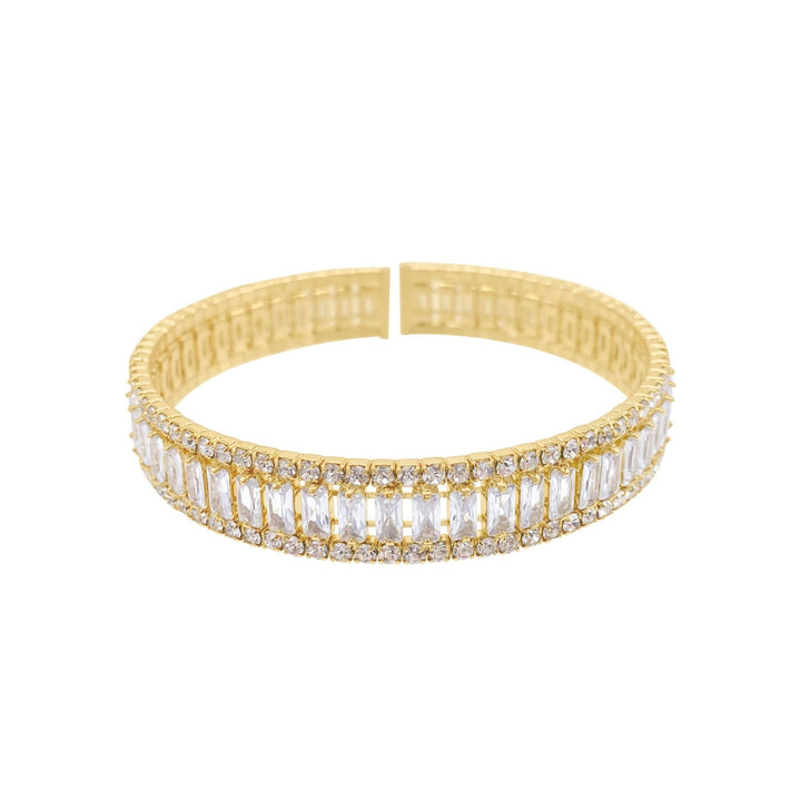 14k gold-plated brass with crystal embellishments. Thickness: 10mm. No clasp. Fits standard wrist size.