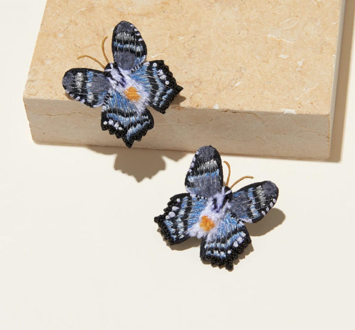 These Gray Cliff Butterfly Stud Earrings in Blue by Mignonne Gavigan: Add a touch of elegance to your look with these beautiful butterfly stud earrings. Crafted from rhodium-plated brass with thread embroidery, these earrings bring intricate craftsmanship and a unique design to your jewelry collection. The 1.5” length and 1.5” width make them a charming accessory for both casual and formal wear.