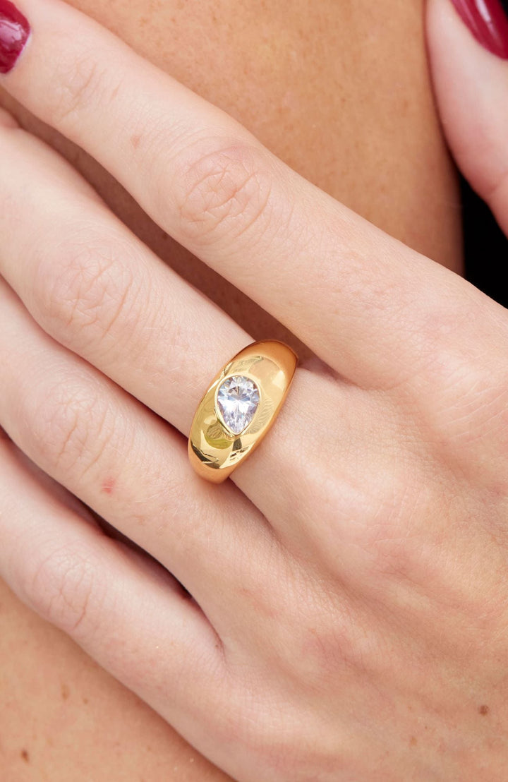Made with 18K gold plating and a white CZ stone. The ring weighs approximately 3 grams.