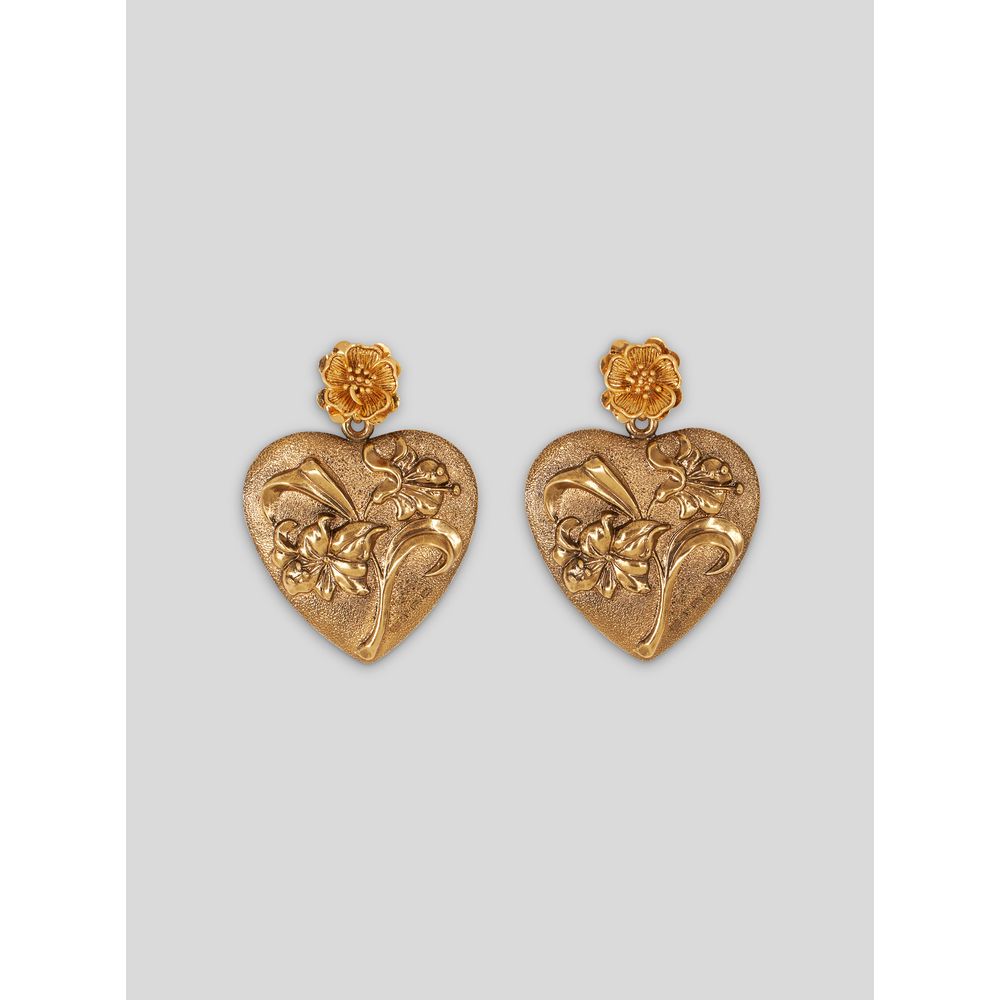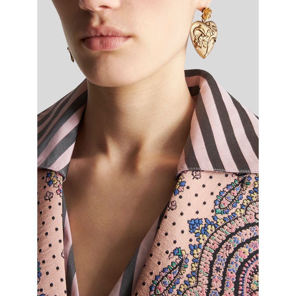These WORKED PENDANT EARRINGS by ETRO feature a heart-shaped pendant inspired by the Fall-Winter 2023 fashion show collection. The intricate lily work adds an artistic touch, making these earrings a unique and striking accessory. Perfect for those who appreciate high fashion with a bold and creative flair.