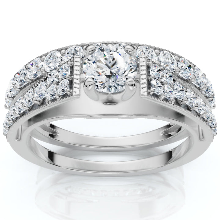 This 1ct TW Vintage Engagement Wedding Ring Set by Pompeii3 is a unique and vintage-inspired design. The set features a 1/3ct center diamond surrounded by round cut accent diamonds, all prong set in solid 14k gold. The matching wedding band completes this elegant and timeless design.