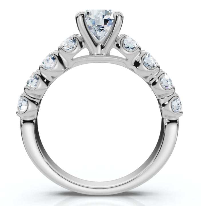 This Certified 3ct Diamond Engagement Ring 14k Gold by Pompeii3 features a 2ct round brilliant-cut lab-grown diamond at the center, surrounded by round-cut accent diamonds. Set in a polished 14k white gold band, this classic design exudes elegance and sophistication, making it a perfect choice for an engagement ring.