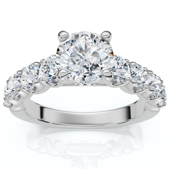 Handcrafted in 14k white gold, featuring a 2ct round brilliant-cut center diamond and round accent diamonds. Prong setting. Polished finish.