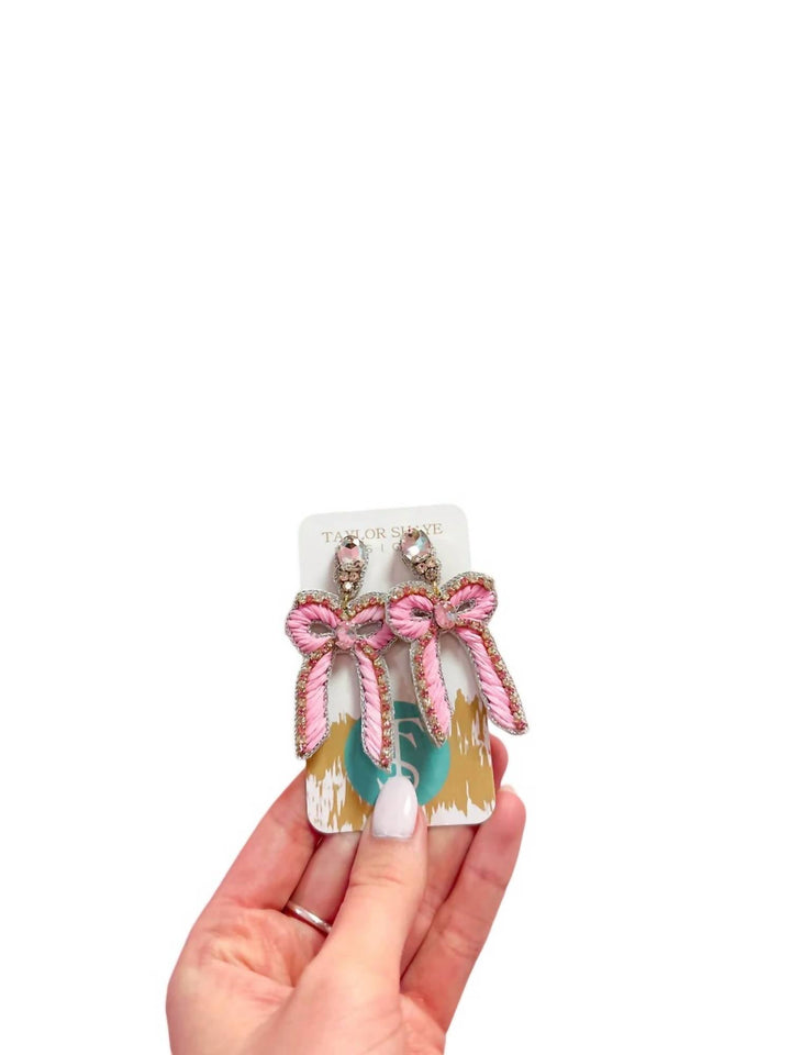 These Women's Beaded Bow Drop Earrings in Baby Pink by Taylor Shaye feature a delicate baby pink color with intricate beaded bow details and a sleek CZ stud post for a touch of sparkle. Perfect for adding a pop of color and elegance to any outfit, these earrings bring a unique and playful design that makes a statement. Ideal for any occasion, these earrings are a versatile addition to your accessory collection.