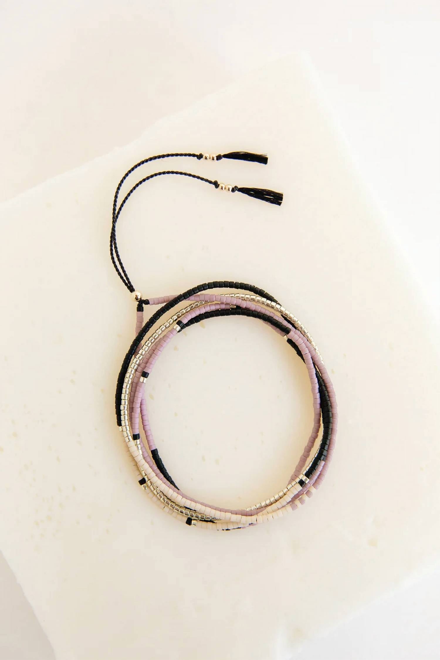 The 'Sonoran Wrap in Galaxy' by Abacus Row features playful patterns crafted with Japanese glass beads, creating a unique piece that can be worn alone or layered.