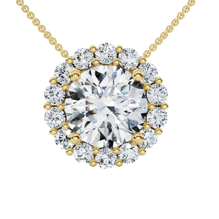 This Certified 3 1/2ct Halo Diamond Pendant Lab Grown 14K Gold Women's Necklace by Pompeii3 features round brilliant cut lab-grown diamonds, set in a solid 14K gold polished mounting. The halo design makes it a perfect addition to stack with other necklaces.