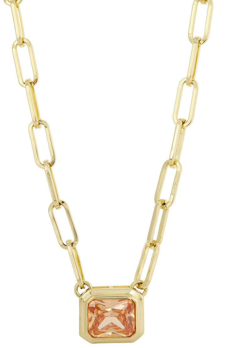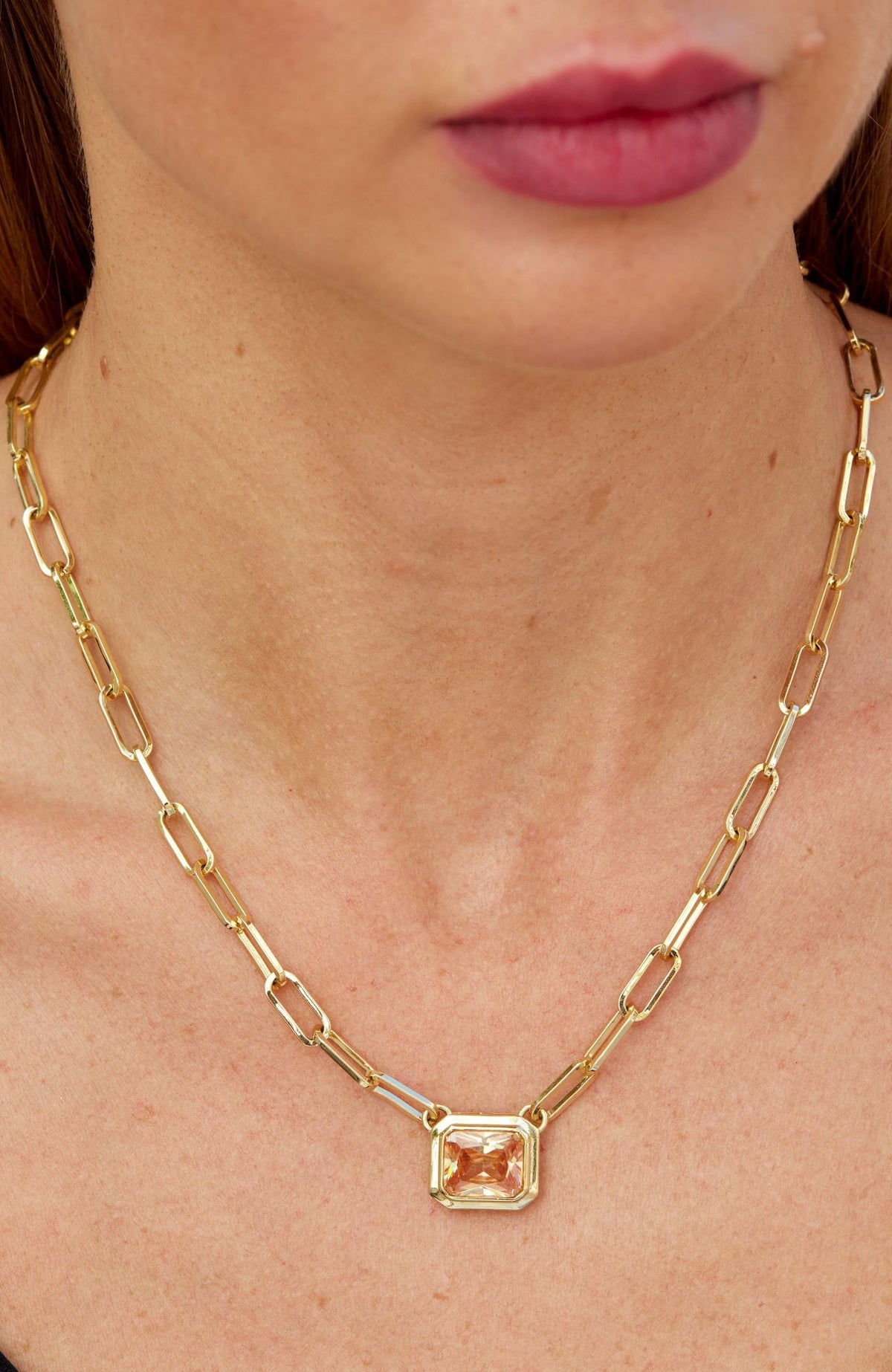 The 18K Gold Plated Paperclip Necklace Champagne Center by Savvy Cie features open paperclip links with a radiant cut champagne center stone, perfect for adding sophistication to any outfit.