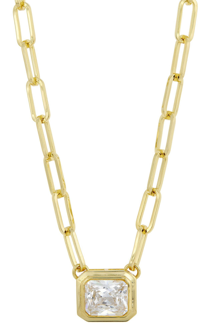 18K Gold Plated over Bronze. Champagne Radiant Cut Center. Chain length: 17' + 2' extender.