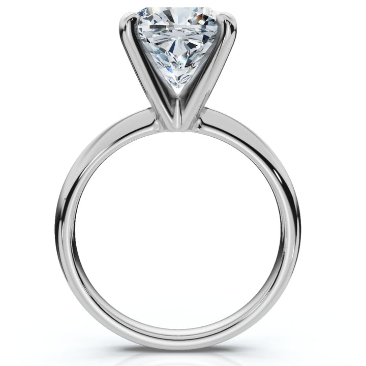 Handcrafted in 14k white gold or platinum, featuring a 5ct cushion-cut lab-grown diamond. Four-prong setting. Polished finish.