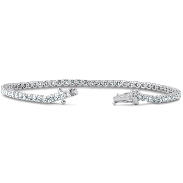 14k white gold with lab-grown diamonds, totaling 5 carats. Bracelet length: 7 inches. Double lock clasp.