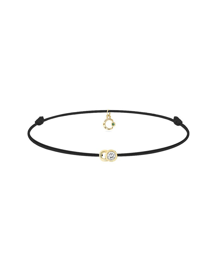 Made with 18K yellow gold and a 0.05 cttw lab-grown round diamond (VS1 clarity) in a pave setting. Adjustable recycled polyester cord fits wrists 14–19 cm. Knot clasp.