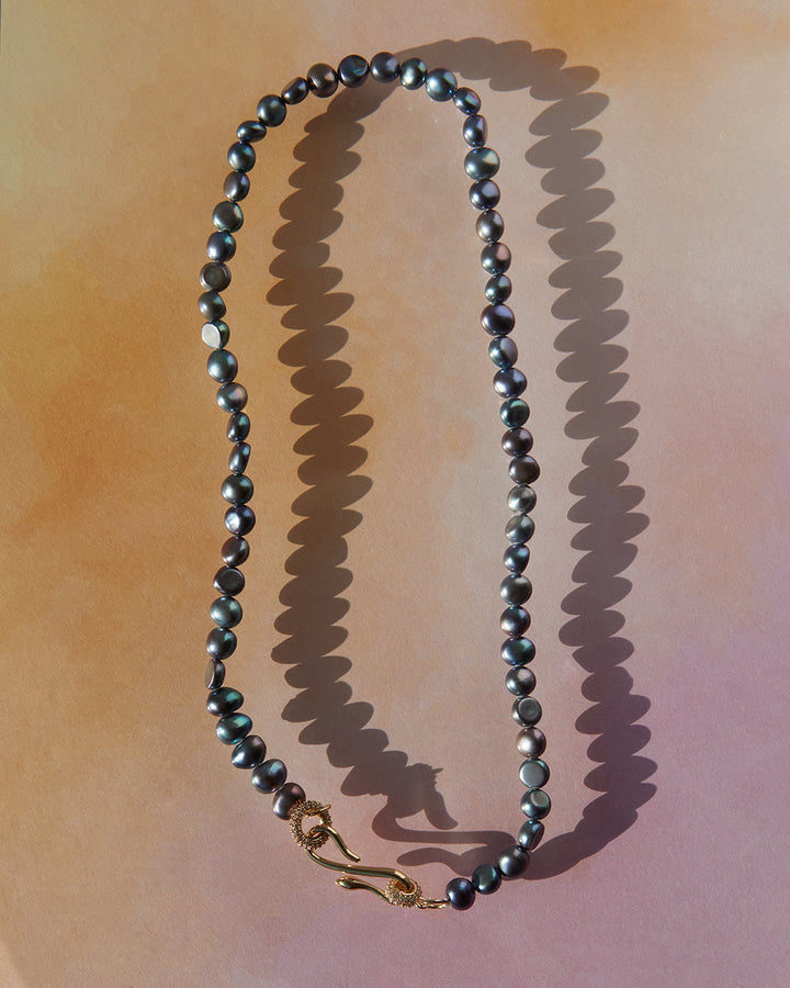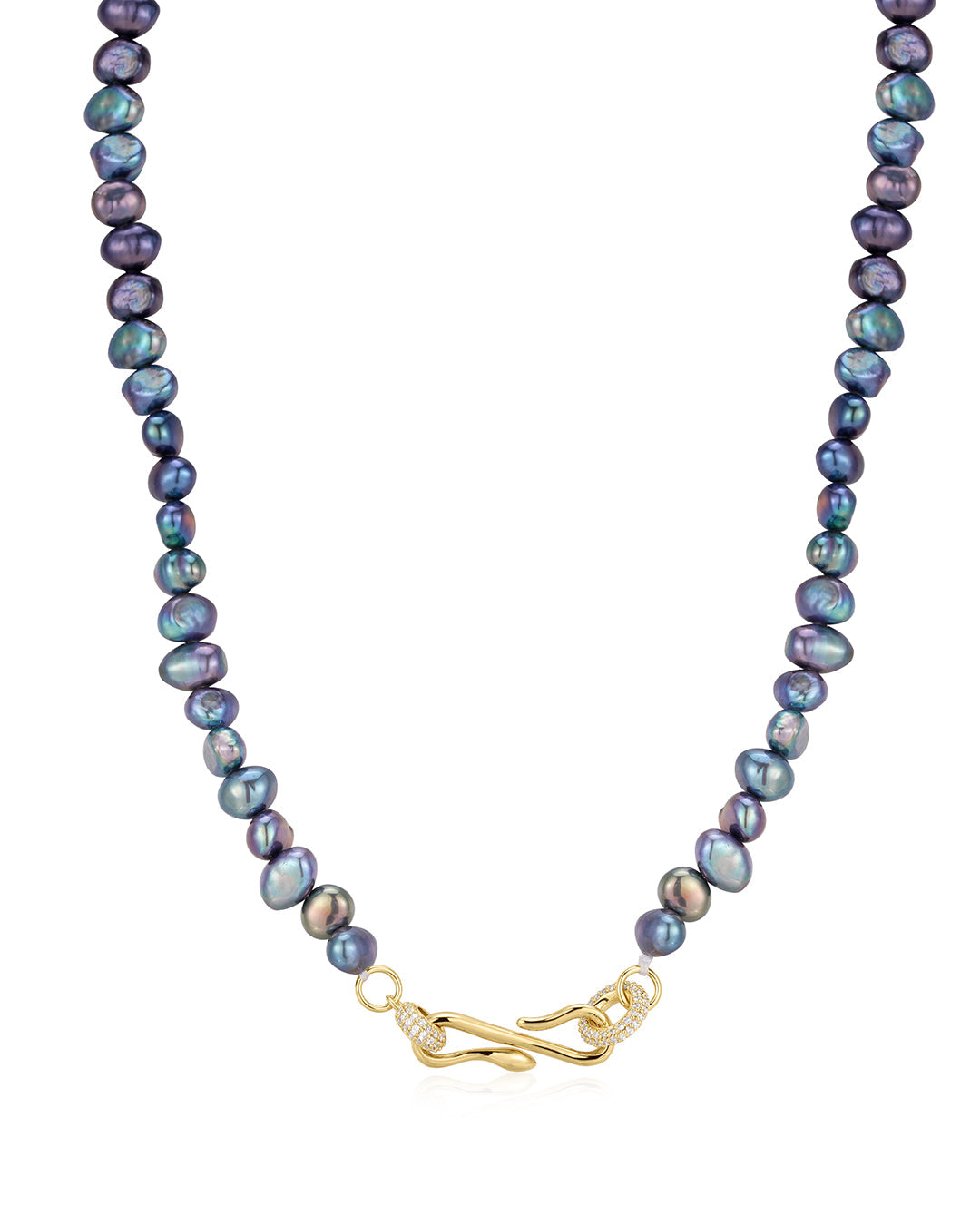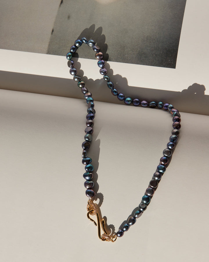 This Pave Hook Pearl Necklace by Luv Aj features a beautiful blue pearl necklace with a pavé looped hook. Perfect for adding a sophisticated, elegant touch to any outfit, this necklace is both chic and versatile. The combination of freshwater pearls and CZ stones ensures that this piece shines in any setting.