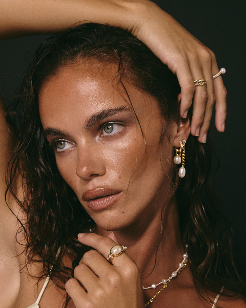 This Pearl Pave Amalfi Ring by Luv Aj brings together classic charm and contemporary shine. At its center, a round freshwater pearl sits delicately within a sparkling pave band, creating a soft yet striking contrast. Designed with understated elegance, this piece evokes a sense of femininity and calm, making it a perfect choice for adding a refined glow to everyday ensembles.