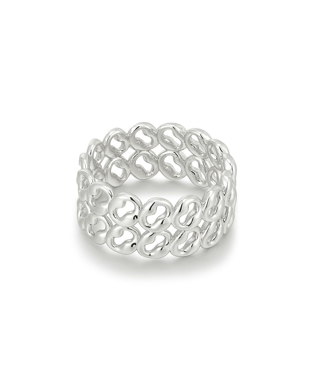 Made from gold- or silver-plated brass with a cutout lace design. Ring dimensions: 9mm x 1.5mm. 100% nickel-free and cadmium-free. Available in US sizes 4–8.