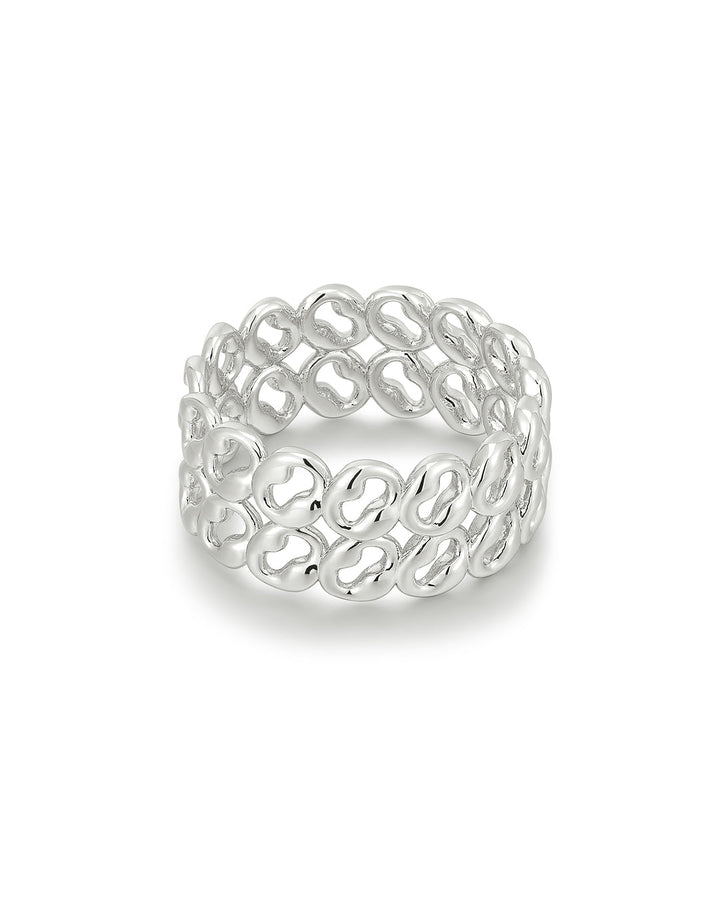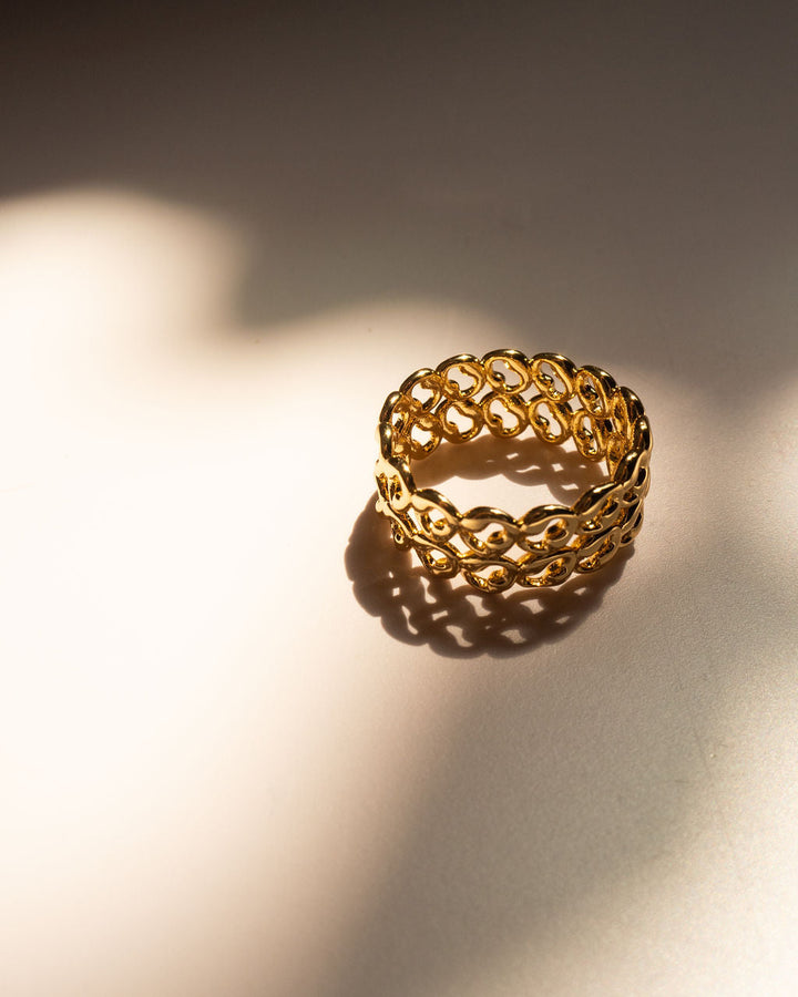 This Metal Lace Ring by Luv Aj draws inspiration from delicate textile motifs, reinterpreted in gleaming metal. Its intricate lacework pattern wraps the finger in a continuous ribbon of detail, balancing texture and shine. Feminine yet bold, this design adds a touch of romance with a contemporary edge—perfect worn solo or stacked for impact.