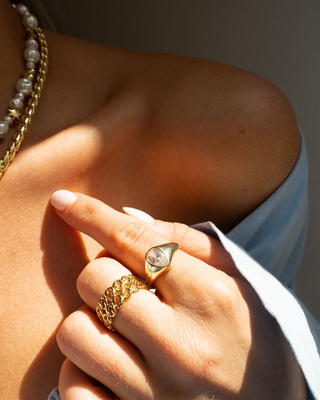 This Poire Bezel Ring by Luv Aj reimagines the signet style with a sleek, pear-cut center stone set in a minimalist bezel. Its elongated shape elongates the finger and catches the light with each gesture, blending vintage inspiration with modern simplicity. It’s a refined accent with just enough sparkle to elevate your everyday look.