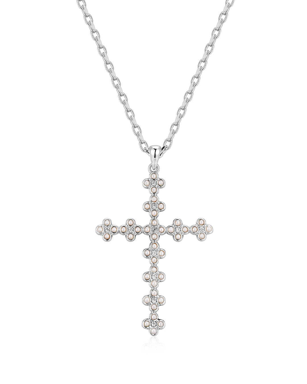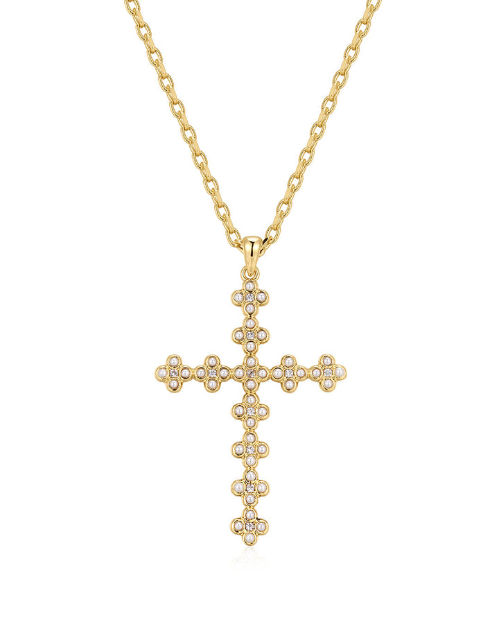These Daisy Stud Cross Necklace by Luv Aj features a cross pendant adorned with CZ stones and faux pearls. The 18-inch necklace is plated in gold or silver, making it a versatile statement piece that will elevate any outfit.