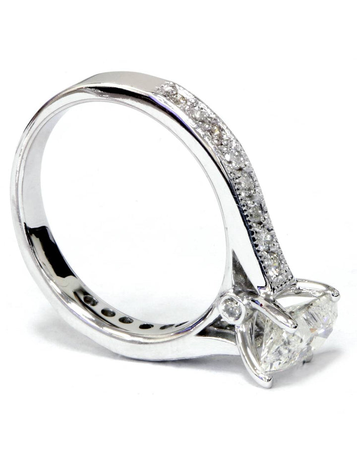 Handcrafted in 14K white gold. Diamonds: 1/3ct oval-cut center diamond, 18 round-cut accent diamonds (1.0 cttw). Clarity: VS. Color: F-G. Cut: Excellent. Origin: Lab-Grown. Average gram weight: 4.0.