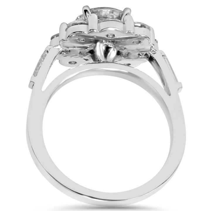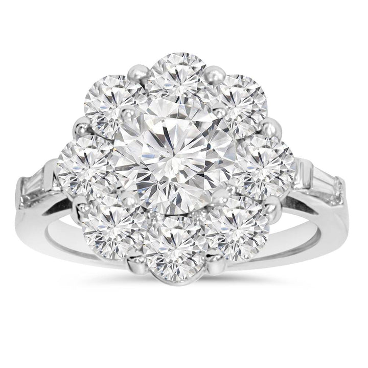 This 3ct Diamond Anniversary Fashion Ring in 10K White Gold by Pompeii3 is designed to capture attention with its stunning combination of diamonds. The 1.25ct center diamond is complemented by 8 round diamonds and 2 baguette diamonds, all set in solid 10K white gold. The high-quality diamonds offer excellent sparkle and brilliance, making this ring a perfect anniversary gift or statement piece.