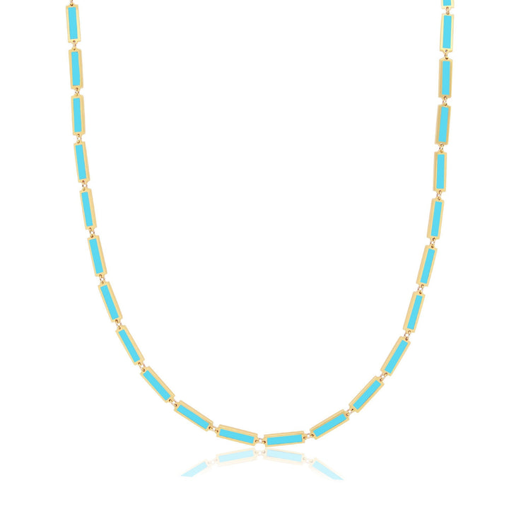 This Turquoise Bar Necklace 16 Inches by The Lovery adds a pop of color to any jewelry collection, featuring vibrant turquoise bars on a simple yet elegant gold chain.
