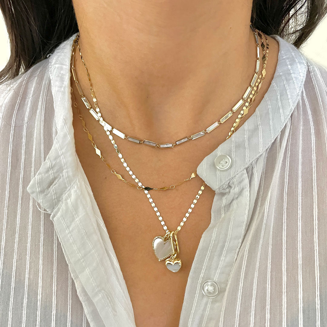 This Mother of Pearl Bar Necklace 18 Inches by The Lovery is a sophisticated and timeless piece that adds a soft iridescent glow to your collection. Featuring 36+ mother of pearl bars set in 14K yellow gold, this necklace is perfect for layering or wearing on its own for a simple yet elegant look.