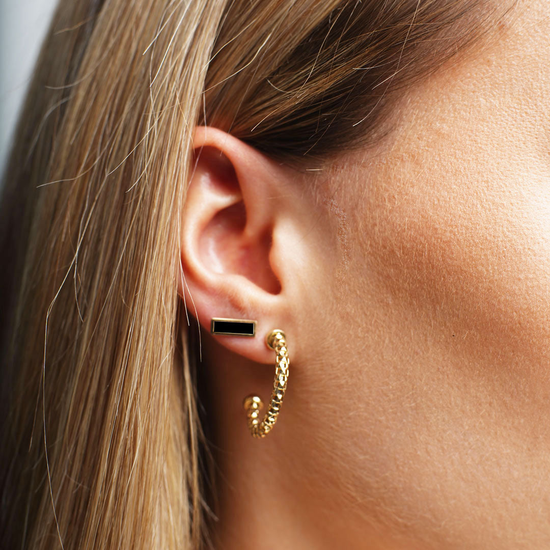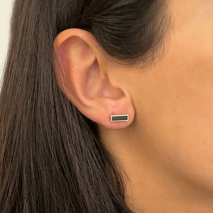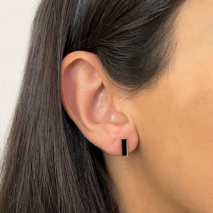 These Onyx Bar Stud Earrings by The Lovery feature two sleek onyx bars set in 14K yellow gold. Each bar measures 3 x 10mm, making them a bold yet refined addition to any collection. These earrings are perfect for adding a pop of color and sophistication to your outfit.