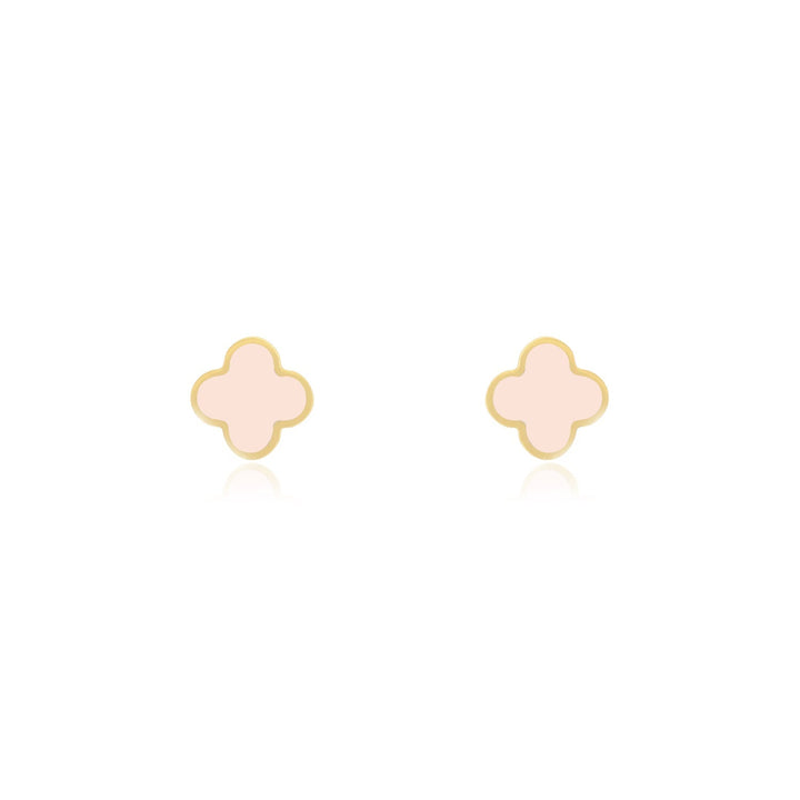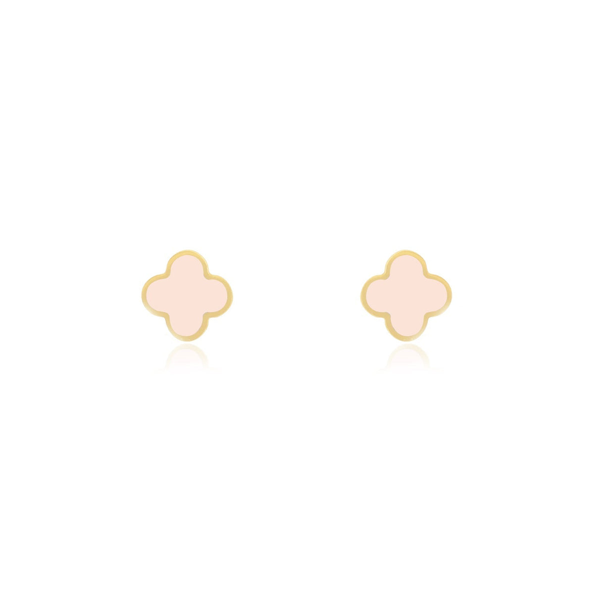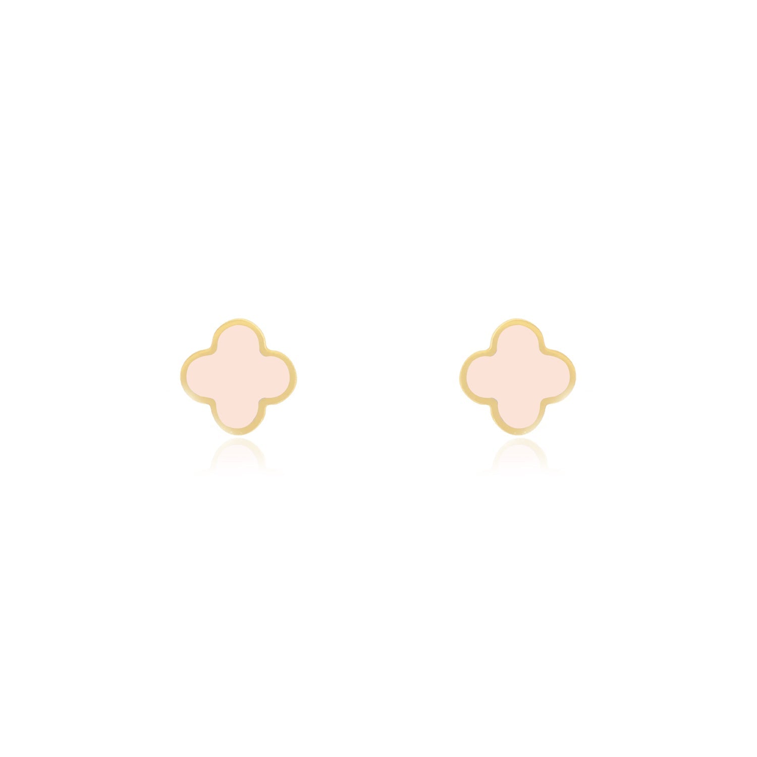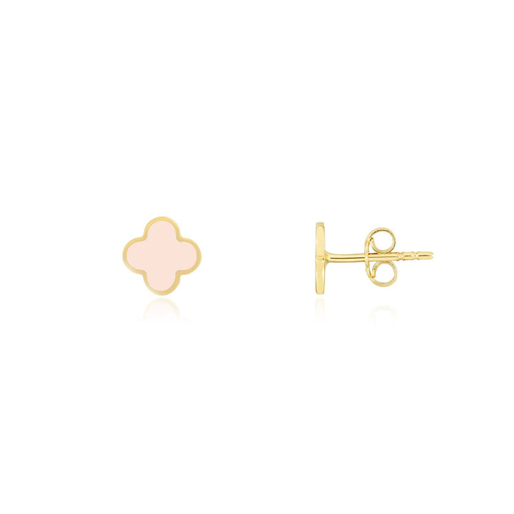 Made with 14K yellow gold and pink pearls. Earring style: Stud. Clover measures: 7mm.