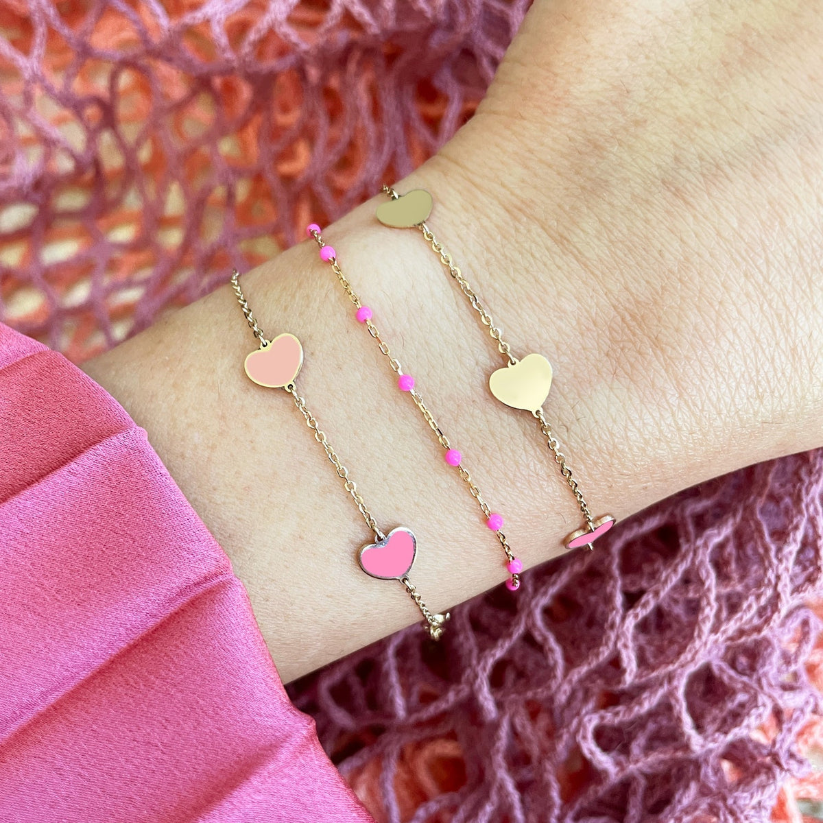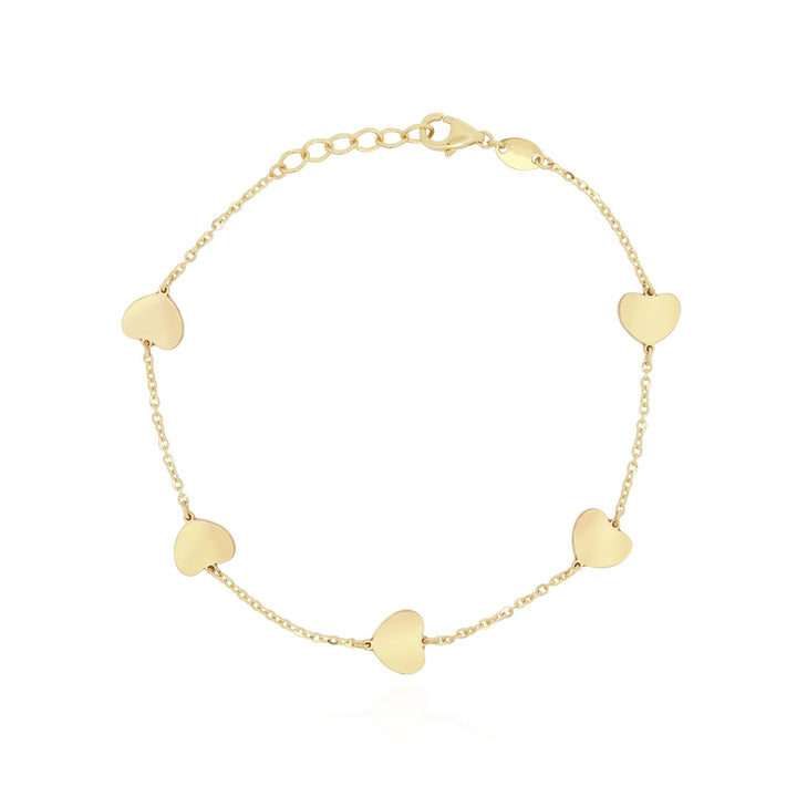 This Gold Heart Station Bracelet by The Lovery features five gold hearts, each 7mm in size, and is perfect for heart-lovers. This bracelet can be worn alone for a simple, elegant look or stacked with other bracelets for a layered effect. The adjustable chain ensures a perfect fit for any wrist.