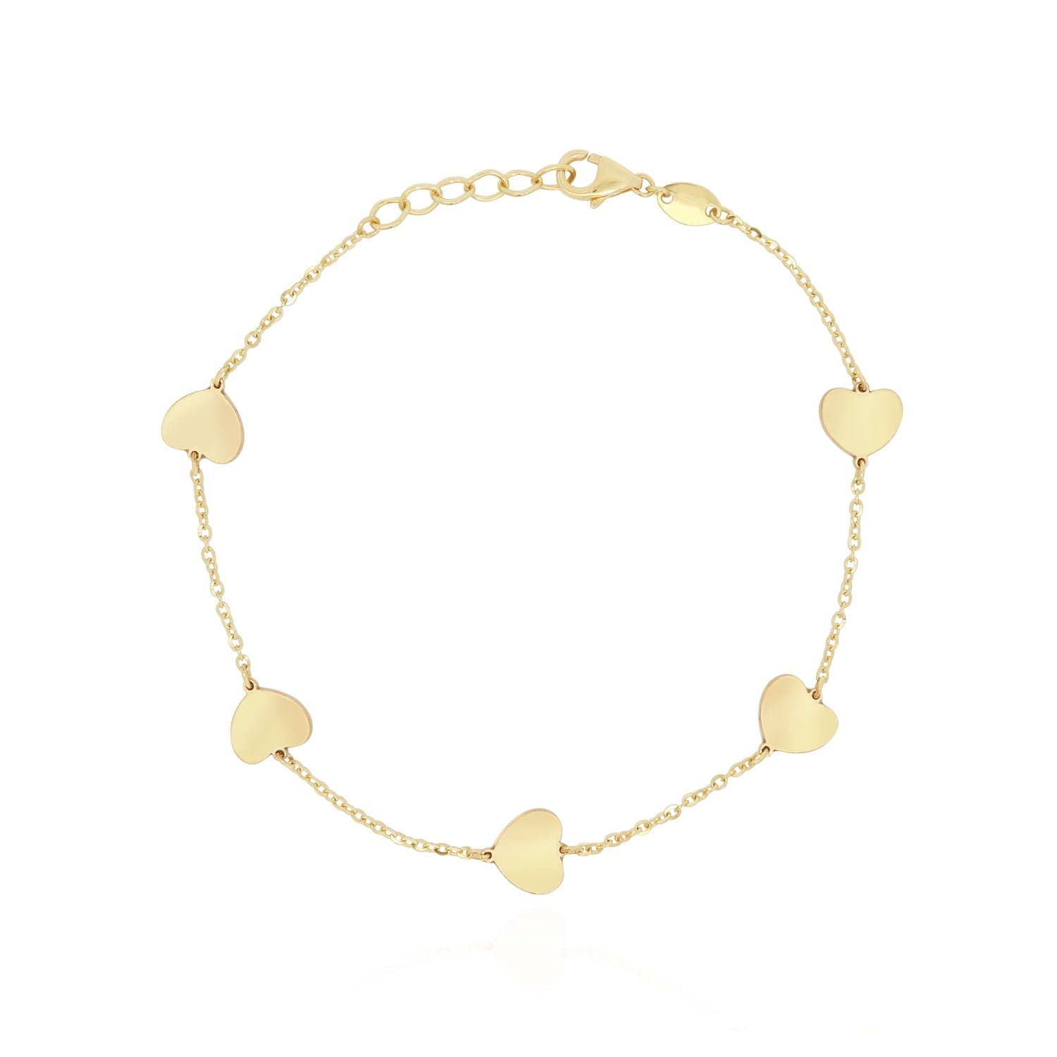 Handcrafted in 14k yellow gold, featuring 5 gold hearts (7mm each), adjustable chain length from 6.5 to 7 inches with a lobster clasp.