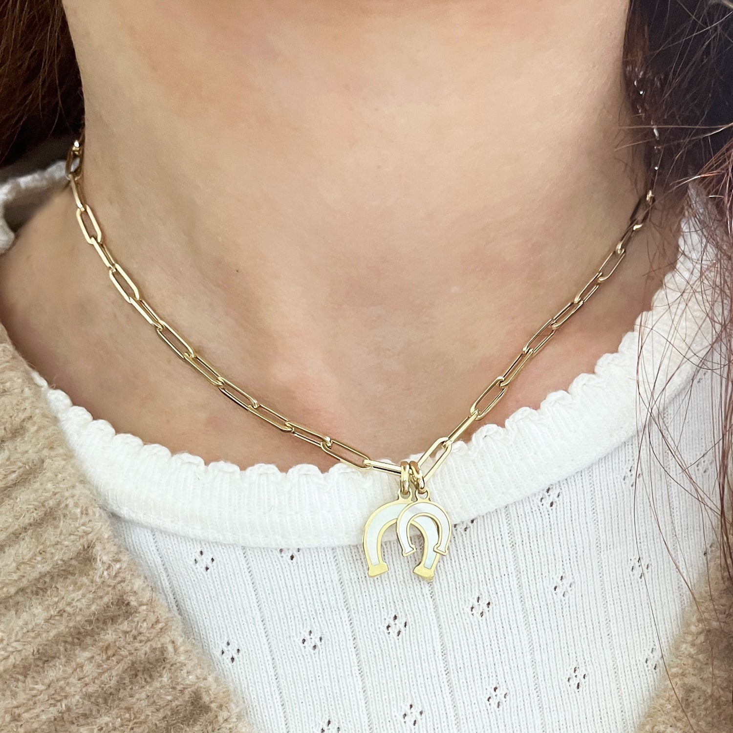 This Mother of Pearl Horseshoe Charm 12mm by The Lovery brings a touch of elegance and good fortune to any jewelry collection. The charm is crafted from 14K yellow gold and features a mother of pearl stone set in the shape of a horseshoe. Both sides of the charm are identical, adding versatility to how it can be worn.