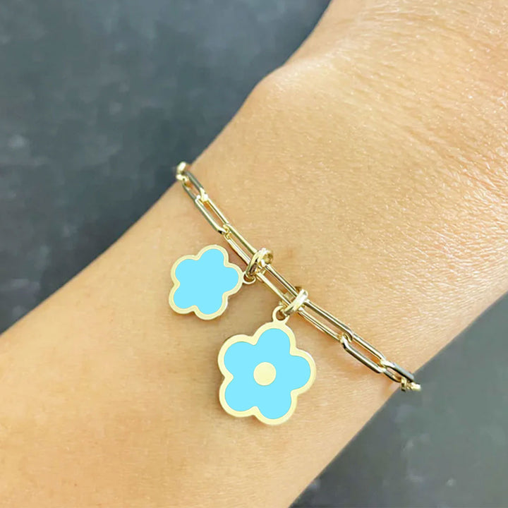 This Turquoise Flower Charm 13mm by The Lovery is a beautiful and vibrant piece, featuring a flower design made from 14K yellow gold and a stunning turquoise stone. Perfect for adding a pop of color and elegance to any chain, this charm is identical on both sides, offering versatile styling options.
