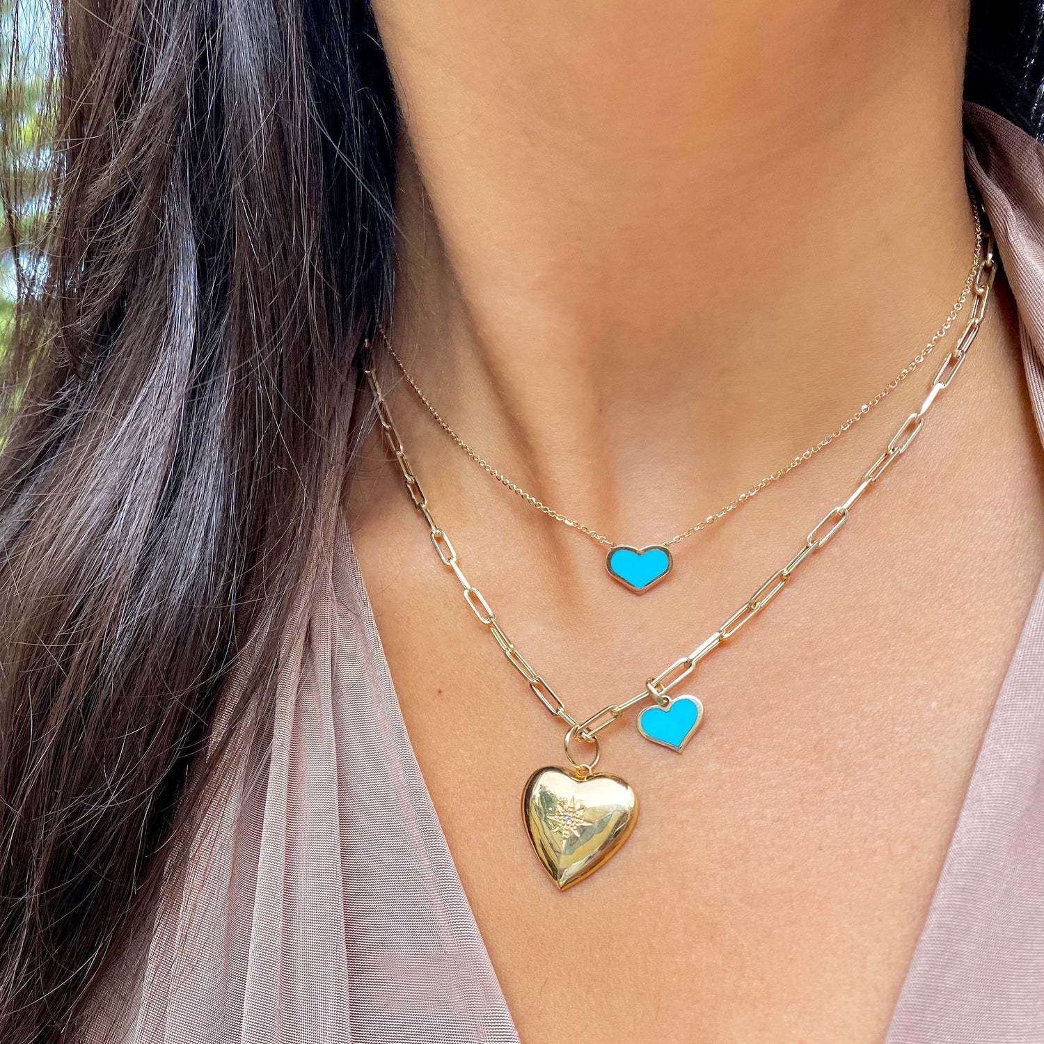 This Turquoise Heart Charm 10mm by The Lovery combines a classic heart shape with the beauty of turquoise. Crafted from 14K yellow gold, this charm adds a soft and vibrant touch to any necklace or bracelet. The identical design on both sides ensures flexibility in how it is worn.