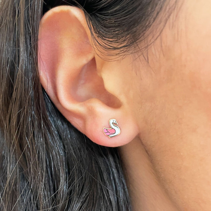 These Swan Stud Earrings by The Lovery are a charming and whimsical addition to your collection. Featuring 14K yellow gold with white and pink enamel, these earrings are perfect for both children and adults alike.
