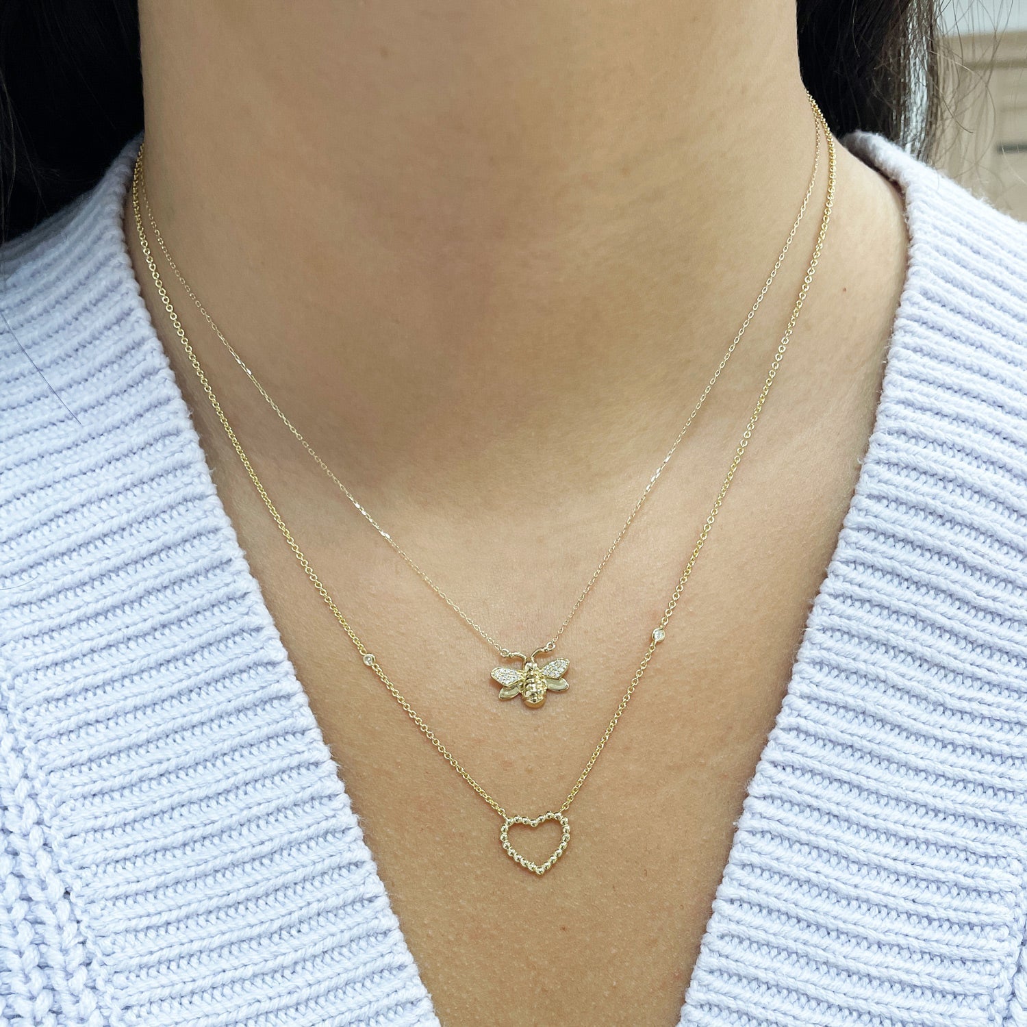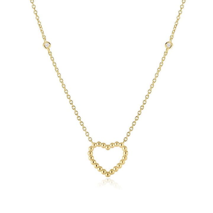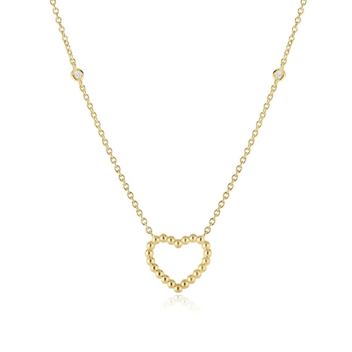 This Gold Bead Open Heart Necklace by The Lovery is a beautiful fusion of dainty elegance and radiant sparkle. The open heart design is paired with two sparkling diamonds for a delicate yet impactful statement.