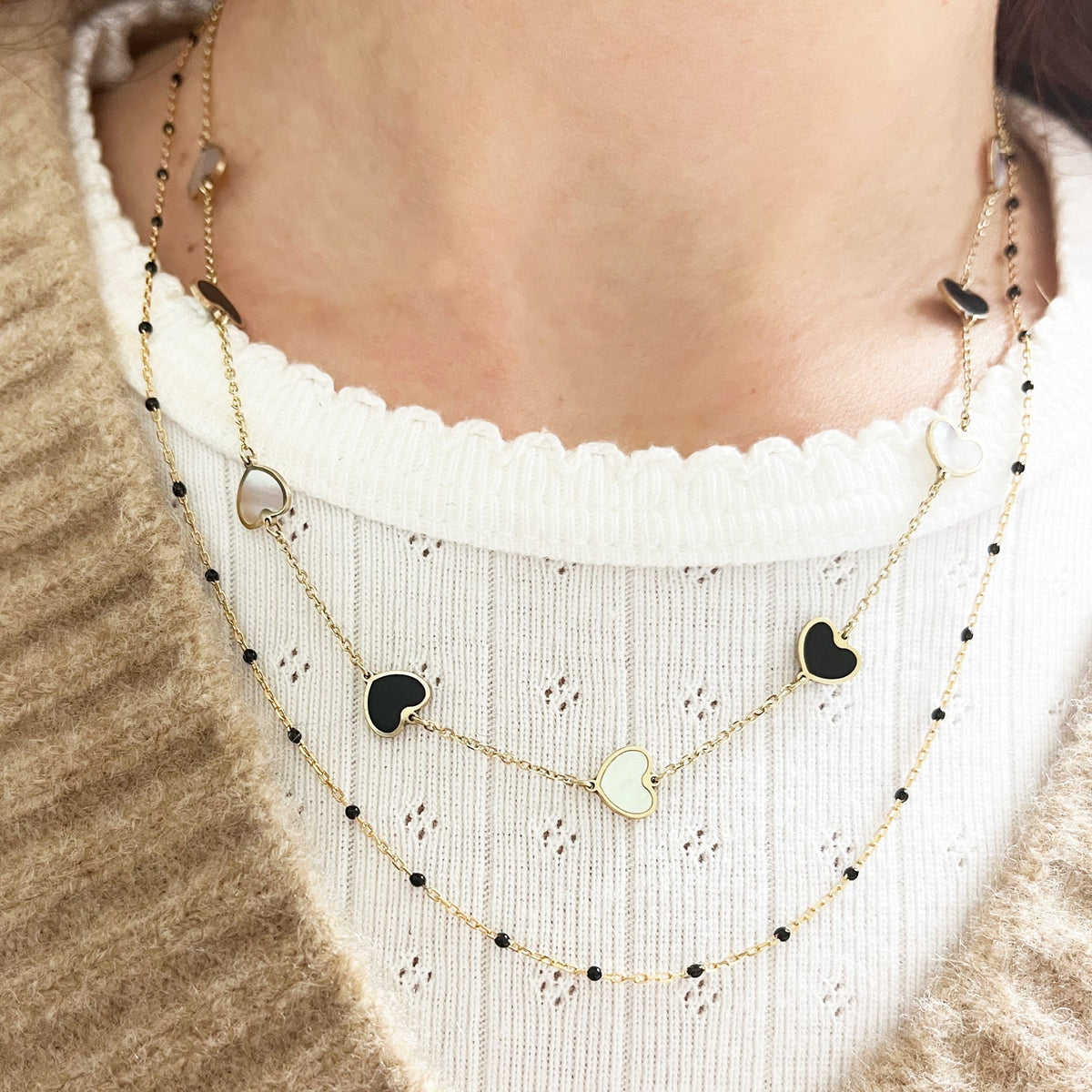 14K yellow gold, 5 mother of pearl hearts, 4 onyx hearts. Each heart measures 7 mm (0.25 inches). Adjustable chain length: 16-18 inches. Lobster clasp closure.