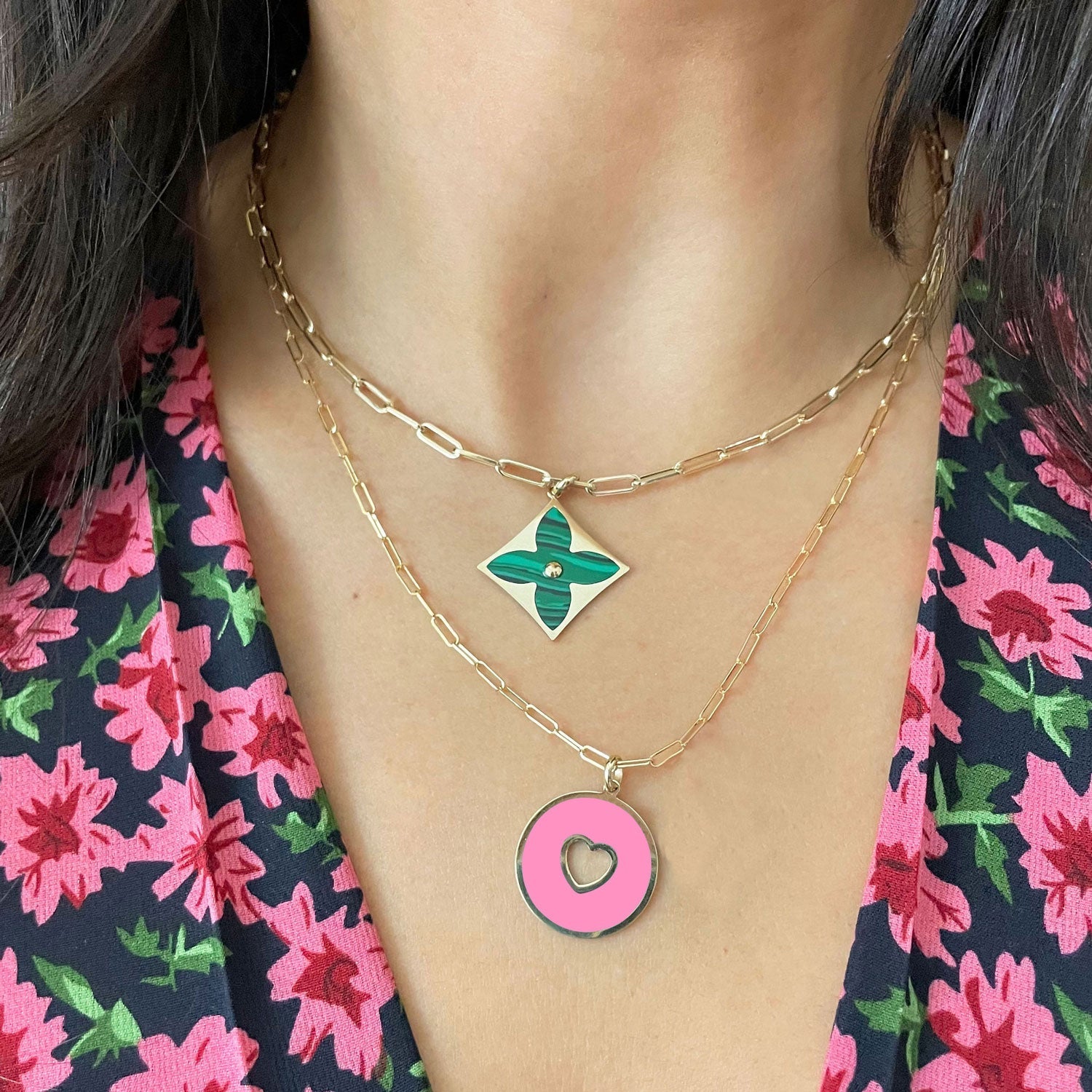 This Bubblegum Pink Donut Heart Charm by The Lovery is a fun and playful addition to your jewelry collection. The charm’s sweet pink hue makes it perfect for adding a touch of color to your favorite chain.