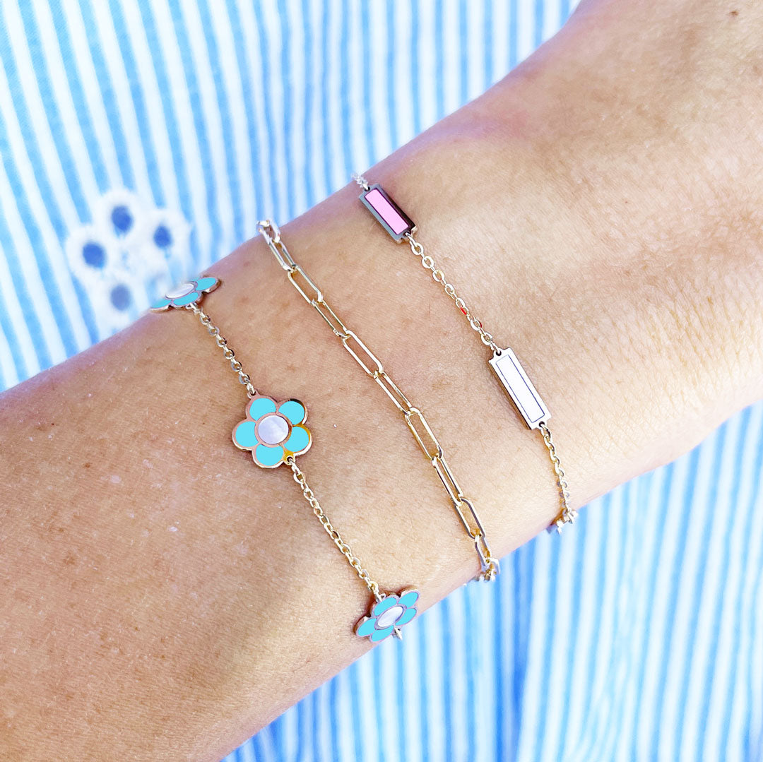 This Turquoise Daisy Bracelet by The Lovery offers a vibrant pop of color, featuring five turquoise and mother of pearl daisies set in 14K yellow gold. Its adjustable chain ensures comfort, while the identical design on both sides adds symmetry and balance. Whether worn alone or stacked, this piece will elevate any outfit.