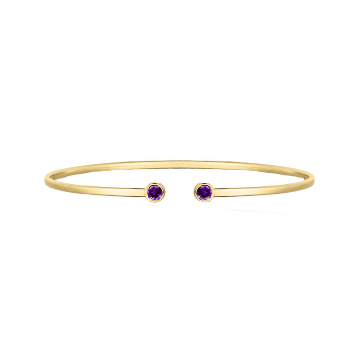 Handcrafted in 14k yellow gold, featuring 2 round amethysts (0.28 ct total), 2mm wide oval bangle, fitting up to a 7.25-inch wrist.