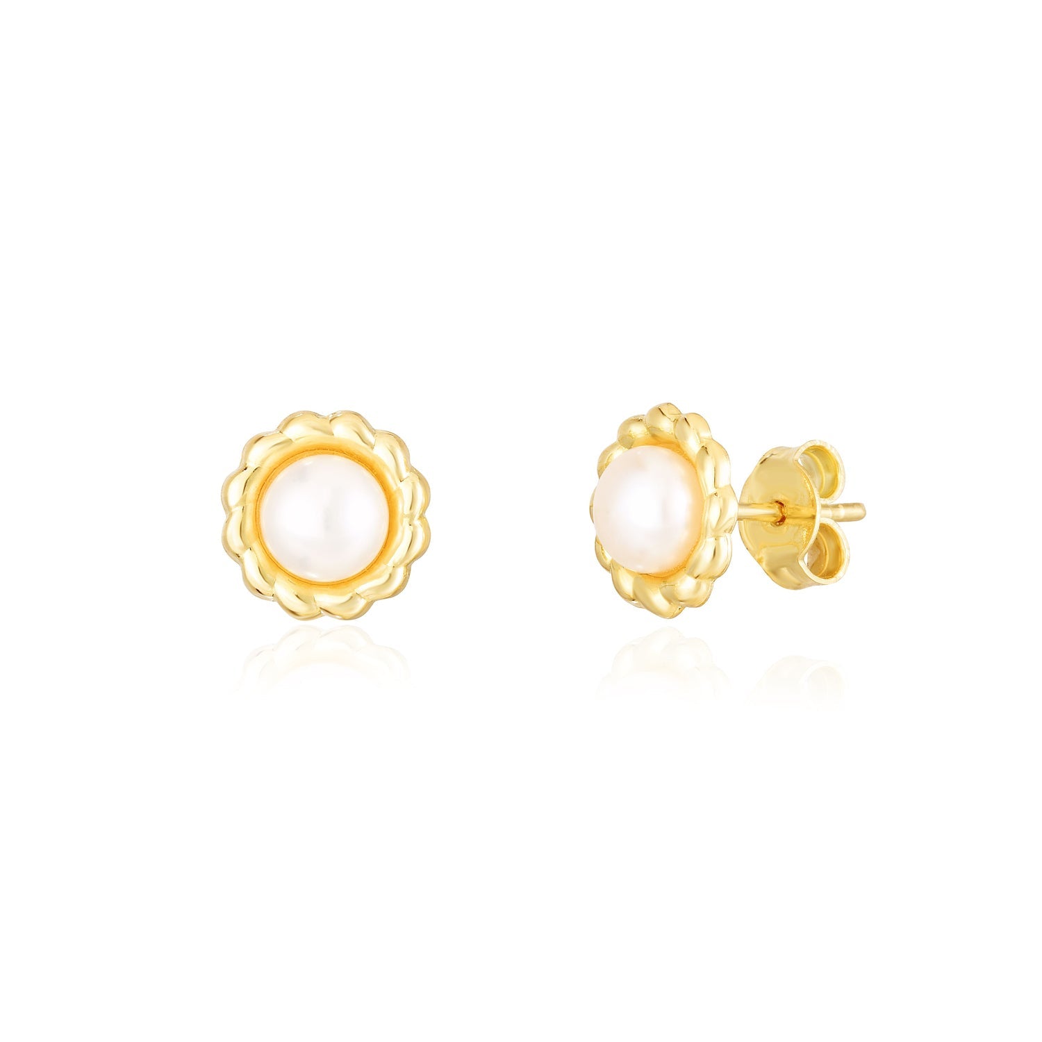 14K yellow gold. Round white pearls (7mm). Flower size: 8.25mm. Sold as a pair.