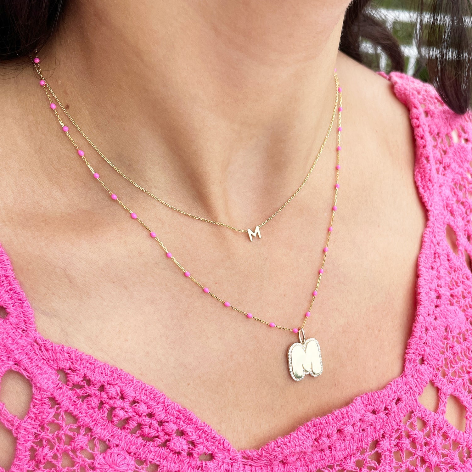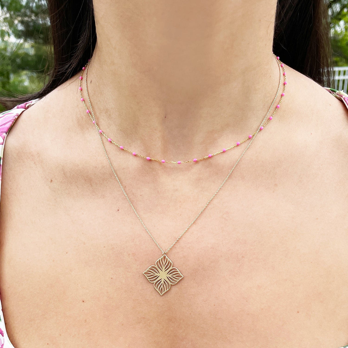Handcrafted in 14K Yellow Gold with Pink Enamel Beads. Adjustable chain length: 16"-18". Rectangle Lobster Clasp.