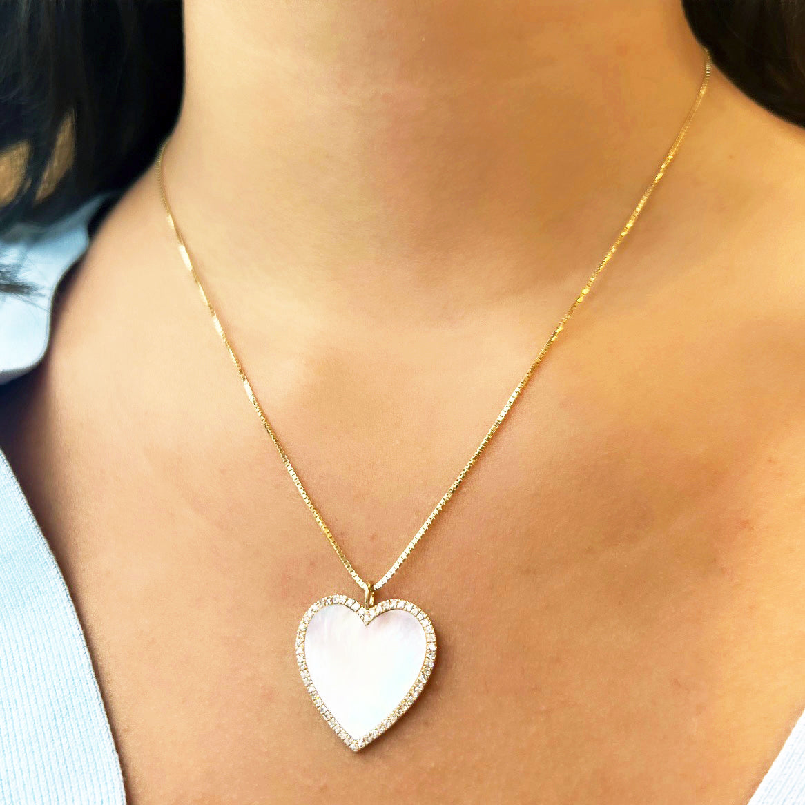 Handcrafted in 14K Yellow Gold with 1 Mother of Pearl Heart and 0.30ct Diamond total weight. Heart measures 23 x 25mm.