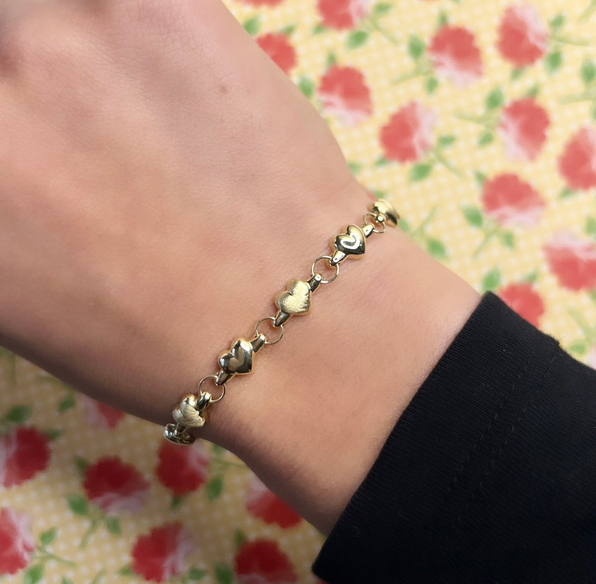 Handcrafted in 14k yellow gold, featuring 12 gold hearts (5mm each), chain length of 7 inches with a lobster clasp.