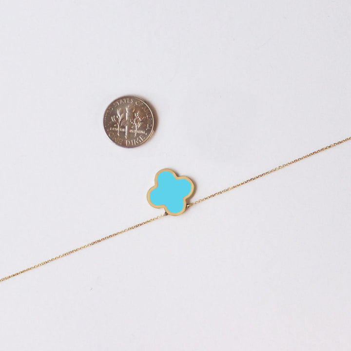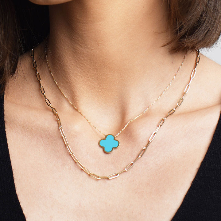 This Extra Large Turquoise Single Clover Necklace by The Lovery features a beautiful turquoise clover pendant, perfect for any occasion. The adjustable chain allows you to wear it at the length you prefer, adding a fresh pop of color to your look.