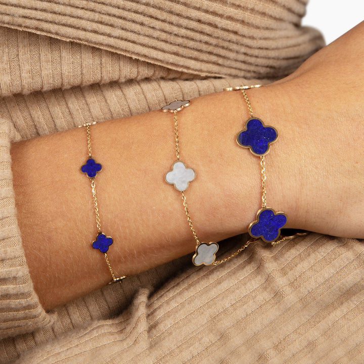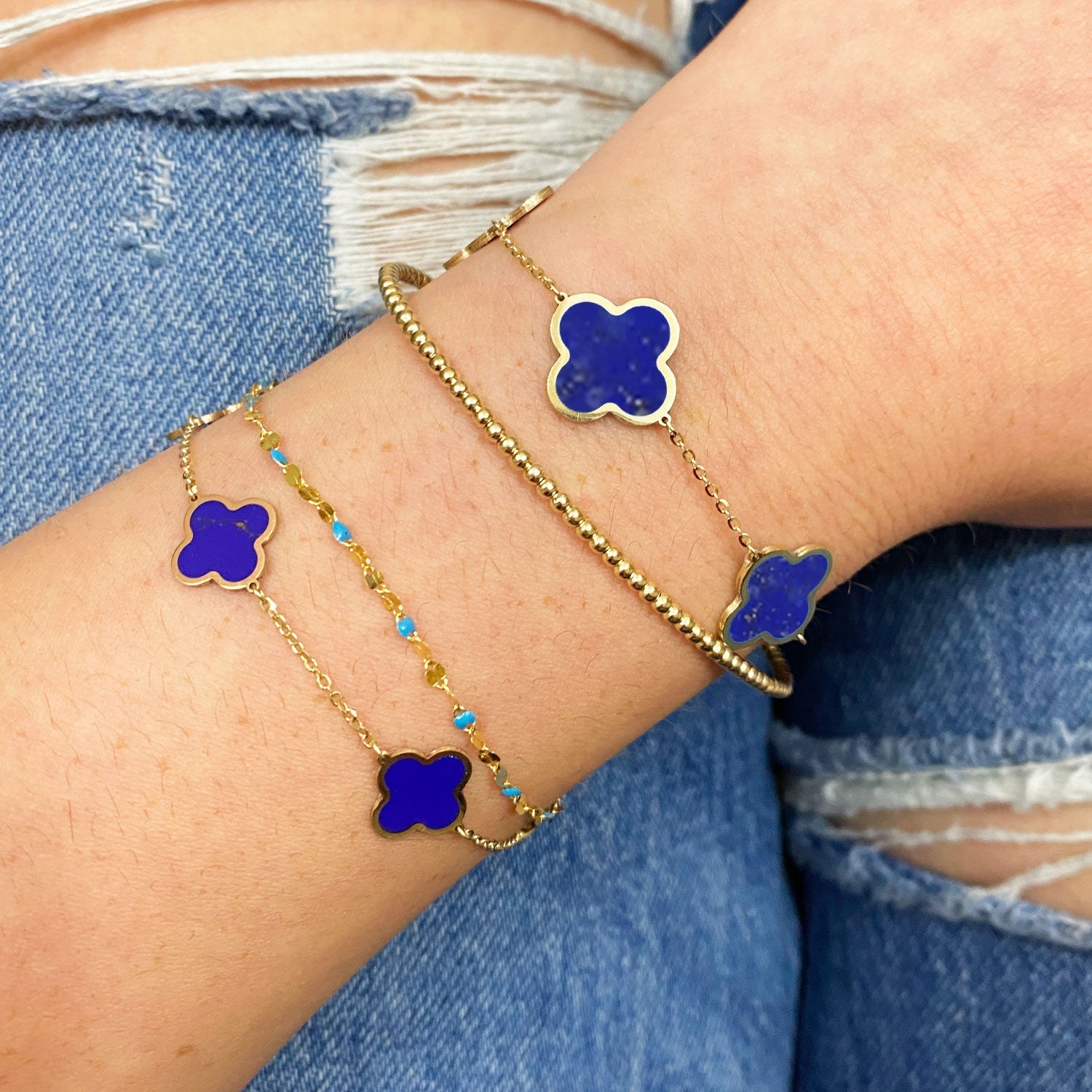 This Large Lapis Clover Bracelet by The Lovery is a stunning statement piece that commands attention. Featuring five large lapis clovers set in luxurious 14k yellow gold, this bracelet is perfect for those who want to stand out. The vibrant blue of the lapis lazuli symbolizes wisdom and truth, making this bracelet both beautiful and meaningful. Ideal for pairing with both formal and casual outfits, this piece exudes elegance and boldness.