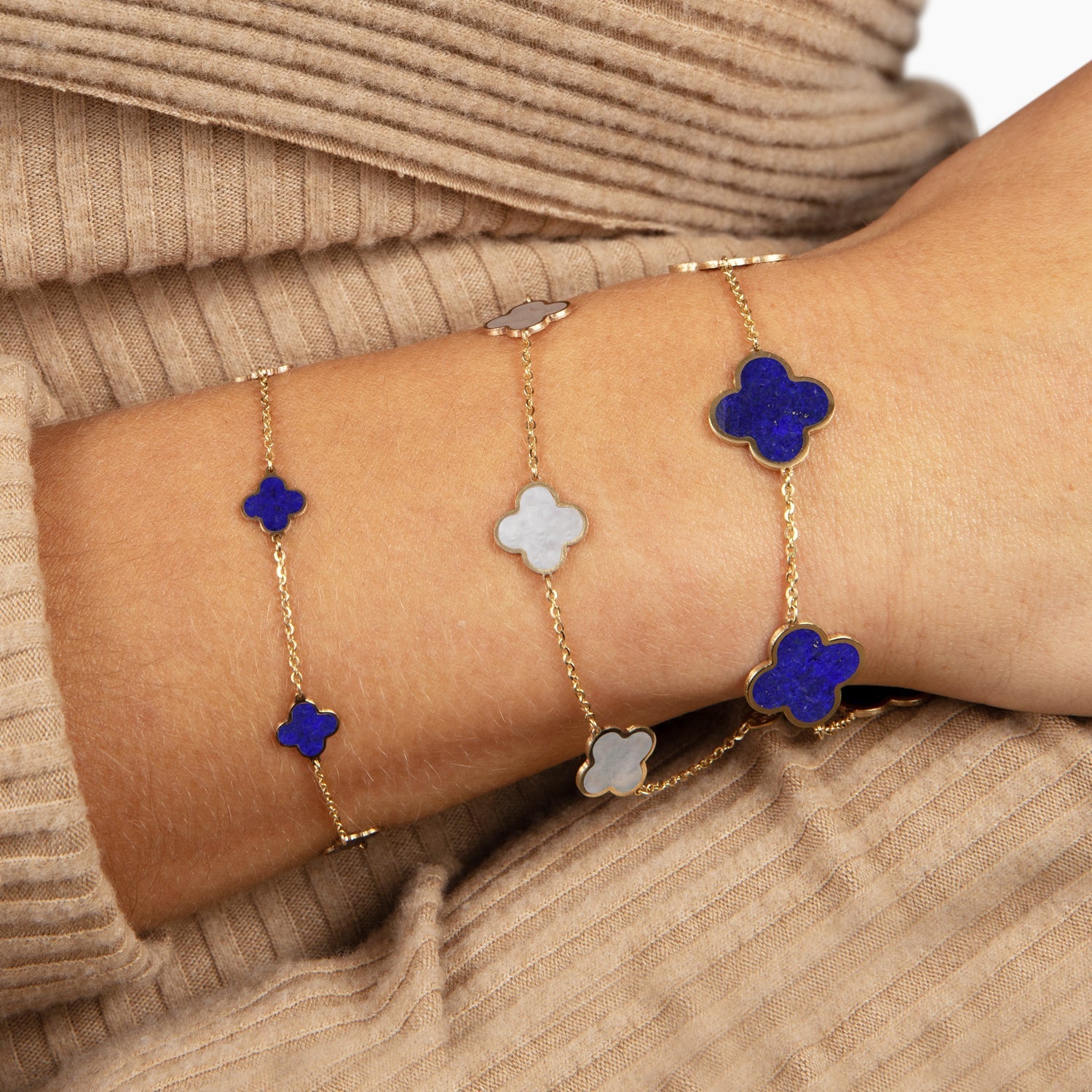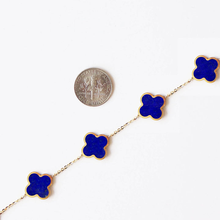 14k yellow gold with 5 lapis clovers. Each clover measures 14mm (0.55 inches). Chain length: 7 inches. Lobster clasp.