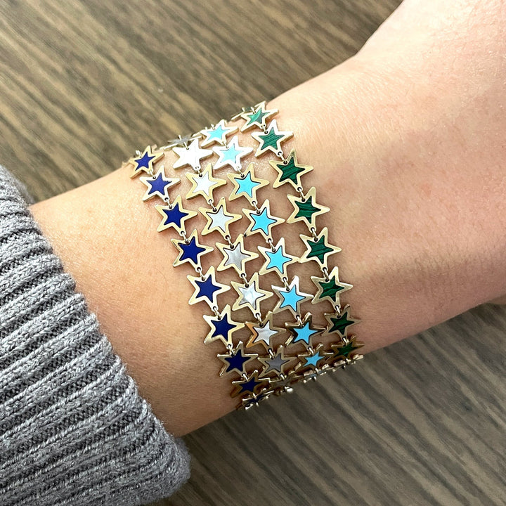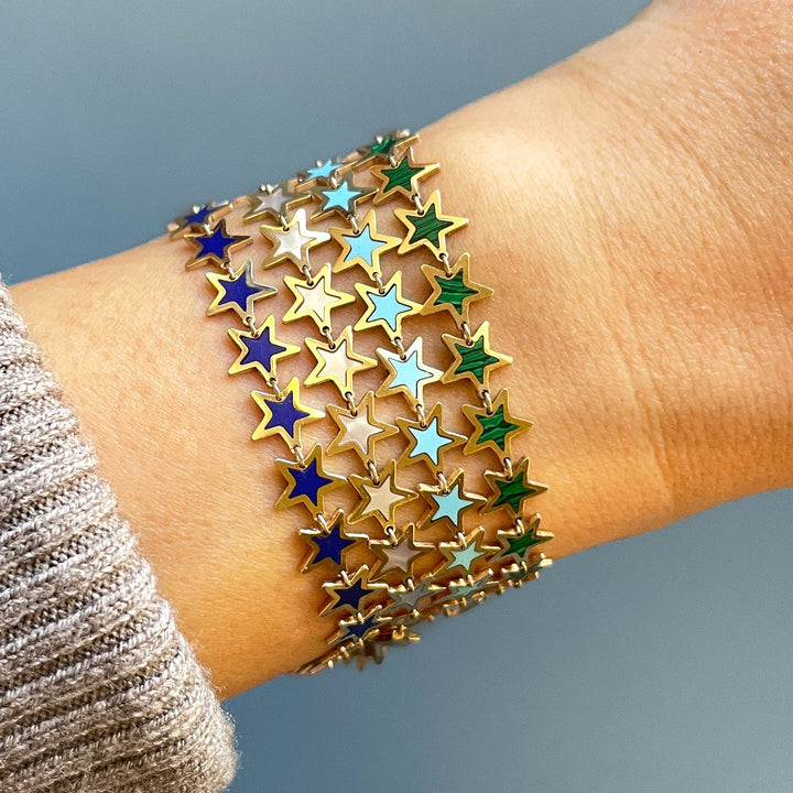 This Malachite Star Bracelet by The Lovery is a bold and striking design featuring 23 malachite stars set in 14k yellow gold. Each star measures 6mm, creating a beautiful and uniform design that can be worn on its own or layered with other bracelets for a standout look.